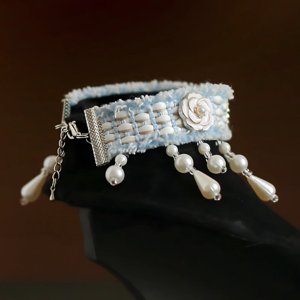 Original design in Chanel-inspired tweed, this pearl cat collar embodies timeless elegance and refined charm.