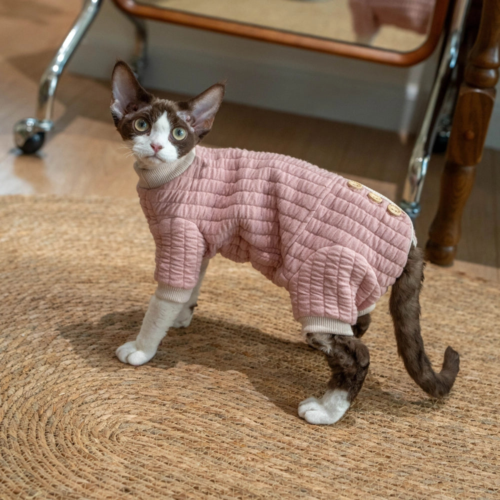 Cozy, warm cotton, full-belly coverage, 4-leg outfit for Devon Rex & Sphynx Cats.