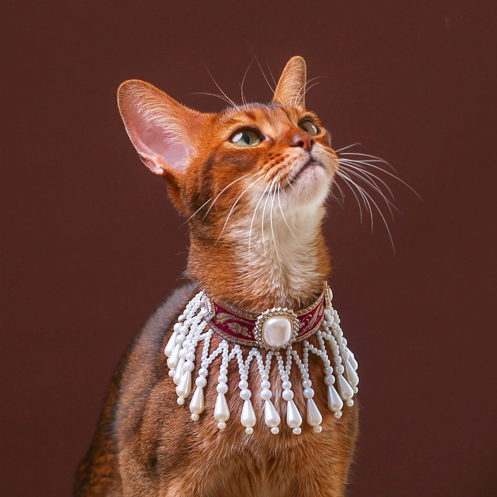 A luxurious, royal-inspired original design cat collar adorned with elegant pearl tassels and a shimmering gem centerpiece.